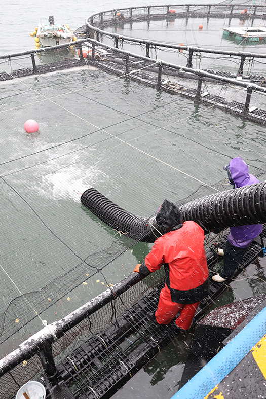 檜山管内で取り組む海面養殖のトラウトサーモン(ニジマス)は、2025年の水揚数量・金額ともに主力のサケを初めて上回った。水揚数量は前年比43%増の86トン、金額は61%増の1億2572万円(税込み)といずれも過去最高を更新。サケやイカなど主要魚種の不振が続く中、地域漁業の代替資源として重要性が増しており、増産体制の拡大と安定化が課題となっている。