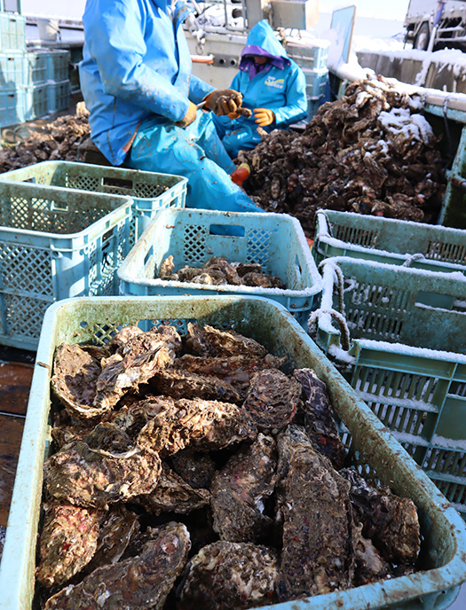 上磯郡漁協知内中ノ川地区で養殖するブランド「知内かき」は身入りが向上、殻付き主体の出荷が続いている。2月に入って餌となるプランクトンが増え、着業者は「一気に身が入った」と振り返る。早い漁家で昨年12月上旬に水揚げ・出荷を開始。着業者によると、放卵後の回復が遅く、カキが入るかご1つ分のむき身生産は年明けの段階で例年を下回る1.5キロほどと芳しくなかったが、現在は2キロ以上と例年並みまで持ち直したという。