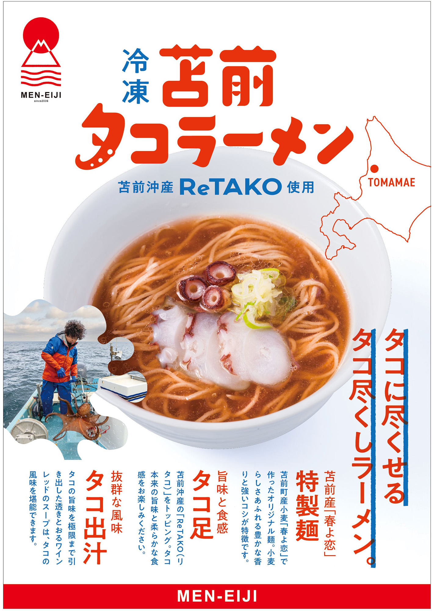 北るもい漁協苫前支所に所属し、個人事業「INAKA BLUE」代表の小笠原宏一さんは、道内外でラーメン店を展開する「MEN-EIJI」代表の古川淳さんとタッグを組み、苫前産ミズダコの皮でだしを取った古川さん考案の「苫前タコラーメン」を売り出した。札幌市内の「MEN-EIJI HIRAGISHI BASE」で6日から提供開始。両者のWEBサイトでも冷凍品で販売している。