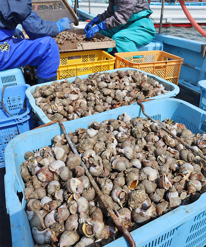 渡島噴火湾の加工貝(2年貝)は、長万部、落部漁協がA貝日産200トン台に増加、4月後半には終漁見込み。計画を超えた砂原、鹿部漁協は近く終漁。8日時点の6単協合計水揚量は1万3千トン余り。前年同期比は57%減、計画に対する達成率は78%。浜値はキロ500円前後で推移する。