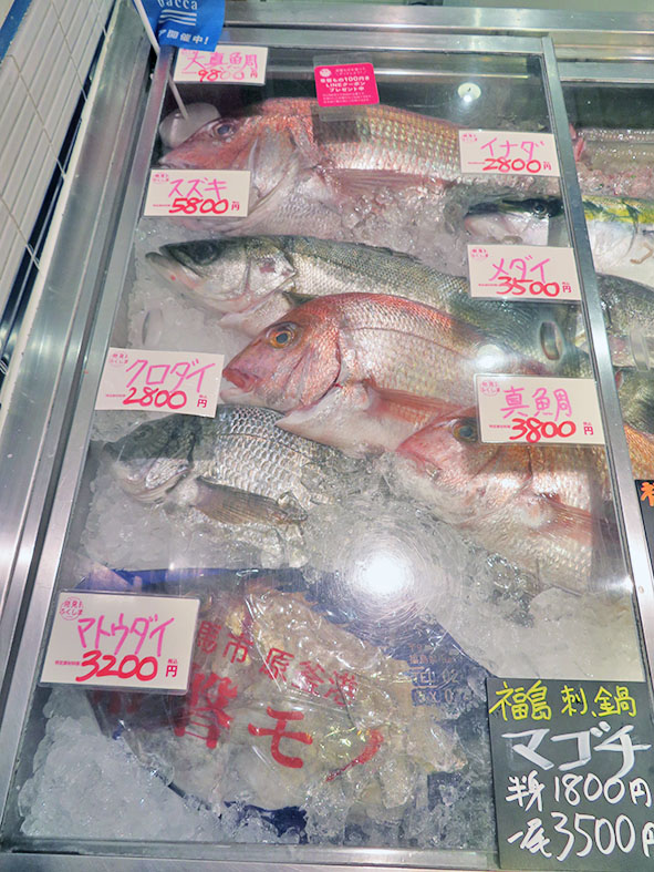 中目黒店の石井店長お薦めのスズキやマトウダイなどが並ぶ鮮魚コーナー