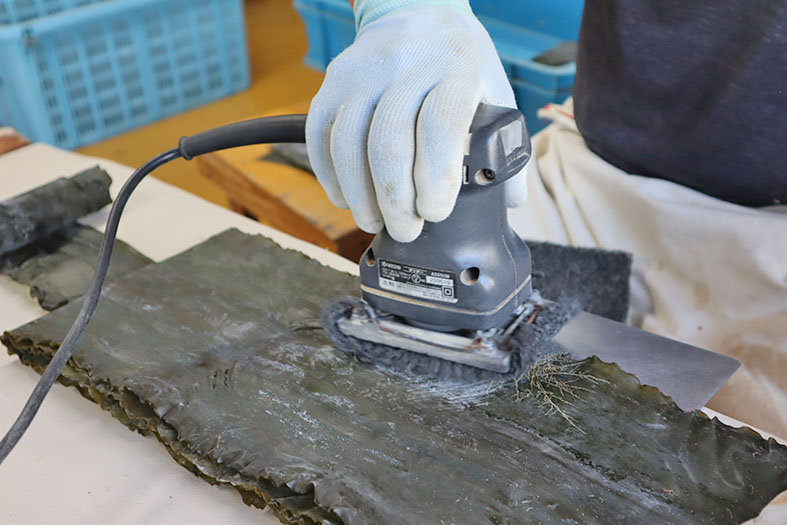 戸井漁協小安地区のコンブ養殖漁業者は、サンダーに工業用パッドを取り付け、コンブ表面に付着した毛(ヒドロゾア)を丁寧に除去、作業の省力化を図っている。サンダーは操作性に優れる手のひらサイズの小型・軽量タイプを利用。工業用パッドをサンダーのパッド部に取り付け、コンブ表面の毛をこすって落とす。着業者は「毛の付き始めの付着が軽い時期はパッドによる手こすりで十分落とすことができるが、付着がひどくなるとサンダーは必須。数十年前から利用しており、毛の除去作業を機械化することで製品づくりの労力を軽減している」と話す。