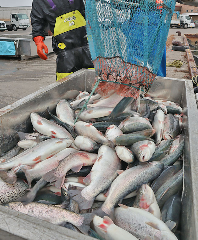 水揚げされた養殖トラウト(11月27日、釧路港)