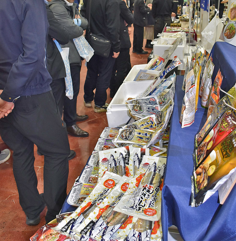 石巻と塩釜エリアを中心に、宮城県内の水産加工品を集めた展示商談会「みやぎ石巻・塩釜合同フード見本市2026」(実行委主催)が10日、仙台市内で行われた。両地区でそれぞれ開催していた見本市を初めて合同で行ったもので、気仙沼などの企業も加わり52社が出展。各地の水産加工品を交通アクセスの良い会場で一堂に見られるとあって、会場には全国から300社を超えるバイヤーが参集、活気ある商談が繰り広げられた。