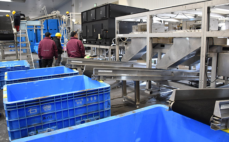 宮城県石巻市で9日、水揚げされた魚種を人工知能(AI)で判別し自動で仕分ける「魚種選別システム」の実証試験があった。東杜シーテック株式会社(仙台市宮城野区、白川清彦社長)らが選別作業の省人化を目指し開発に取り組んでいるもので、2024年2月に続き石巻魚市場で実施。前回の試験を踏まえ改善を図った装置で、サバとアジを約90%の精度で判別。28年以降と想定する実用化に向け歩みを進めている。