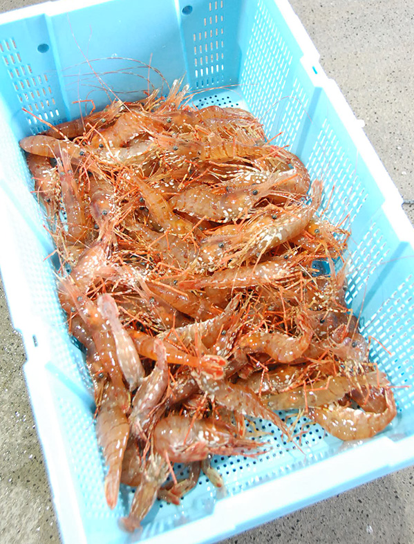 薄漁のボタンエビ(3月16日、砂原漁協市場)