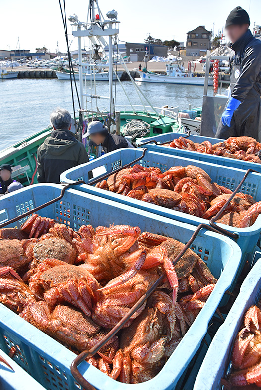 流氷で出遅れた毛ガニ荷揚げ(3月25日、沙留漁港)