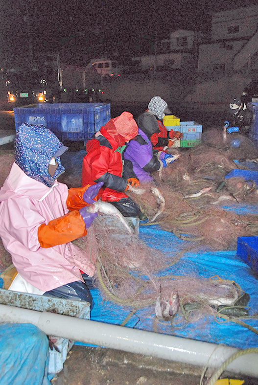 薄漁高値で推移しているスケソの網外し作業(11月25日、木直港)