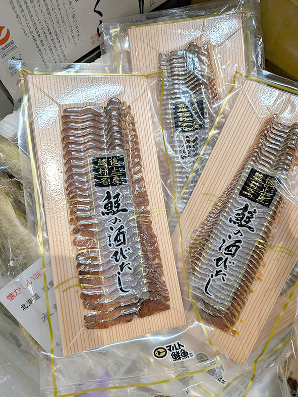 新潟県村上市の株式会社マルト鮮魚が製造する「鮭の酒びたし」が珍味乾物を扱う東京都・豊洲市場の仲卸を通じて首都圏の日本酒専門店や居酒屋に供給されている。塩引き鮭をカラカラに乾燥させた無添加の伝統食品で、薄切りスライスを日本酒や焼酎に浸しながら楽しむ通好みの一品だ。