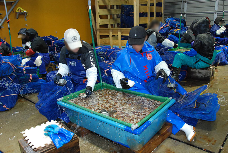 留萌管内で稚貝の本分散が進んでいる。各漁協とも仮分散段階では必要以上に確保したものの、夏場の高水温に伴うへい死やフグ、カニの食害が影響し、地区によっては「余裕がなくなった」と話す着業者も少なくない。不足した場合に補充できるよう小型の稚貝はザブトンかごに戻して再度垂下し直す漁家もある。