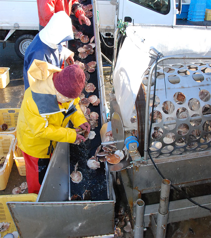 いぶり噴火湾漁協の加工貝出荷が日産200トン前後に増え最盛期を迎えた。昨春の稚貝不足で耳づり本数が減少し段数を減らす漁家も多く、1本当たりの重量は十数キロと物足りないが、サイズは例年並みに成長し終盤のひと伸びに期待している。浜値は一時キロ300円台に下げたが、渡島側の出荷減も絡み500円前後に上昇した。昨年10月~今年2月の水揚量は前年同期比19%減2820トン。計画に対する達成率は43%。キロ平均単価は30%安434円。